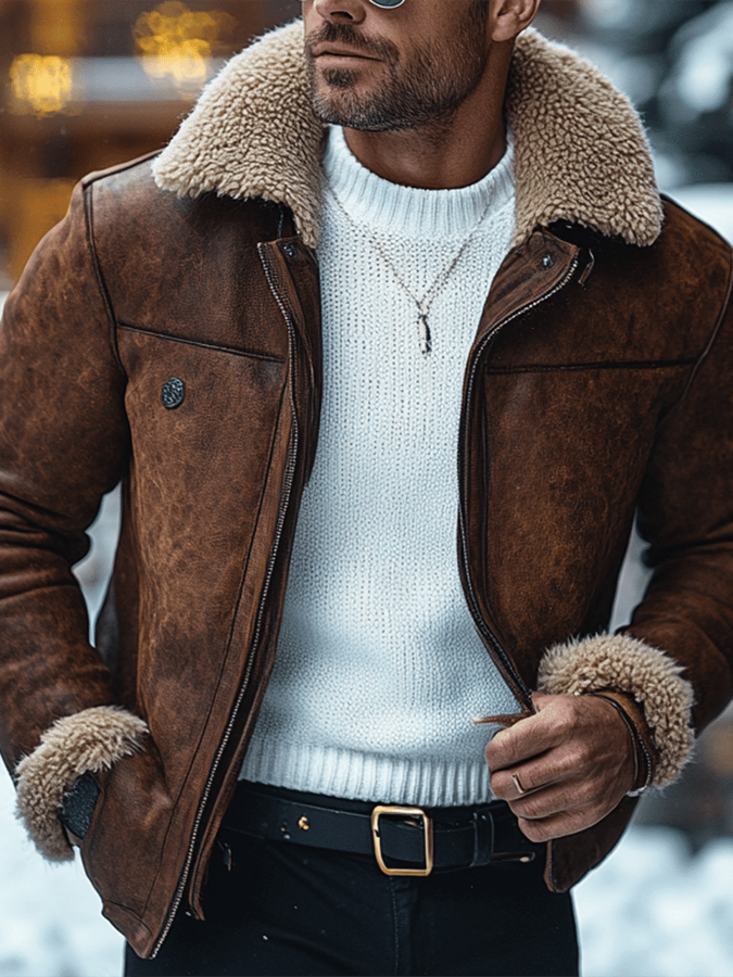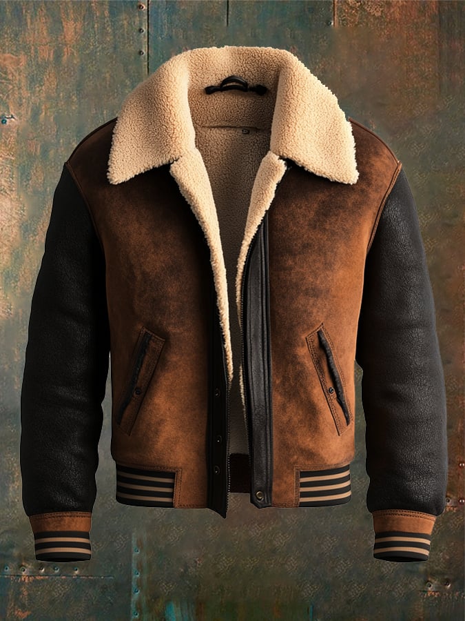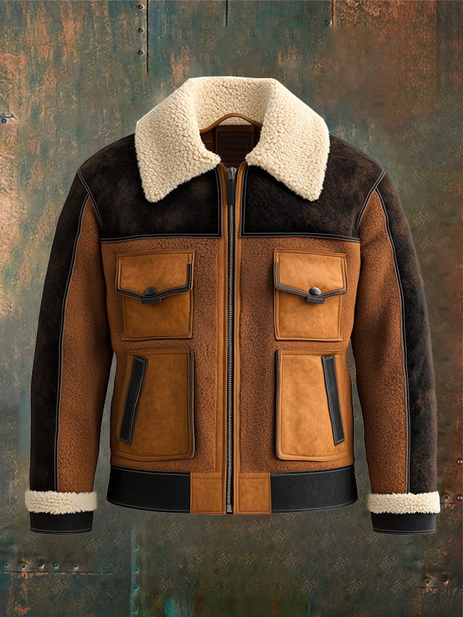 Men's Vintage Suede Patchwork Lamb Fleece Multi-Pocket Reverse Collar Outdoor Jacket