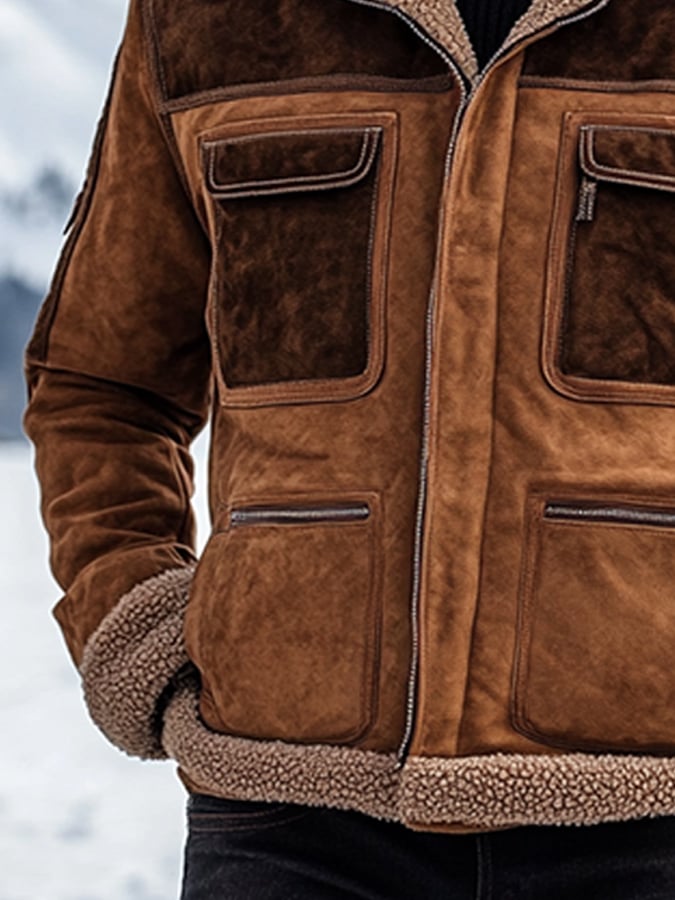 Men's Vintage Suede Patchwork Lamb Fleece Multi-Pocket Reverse Collar Outdoor Jacket