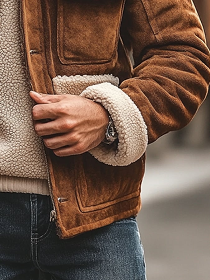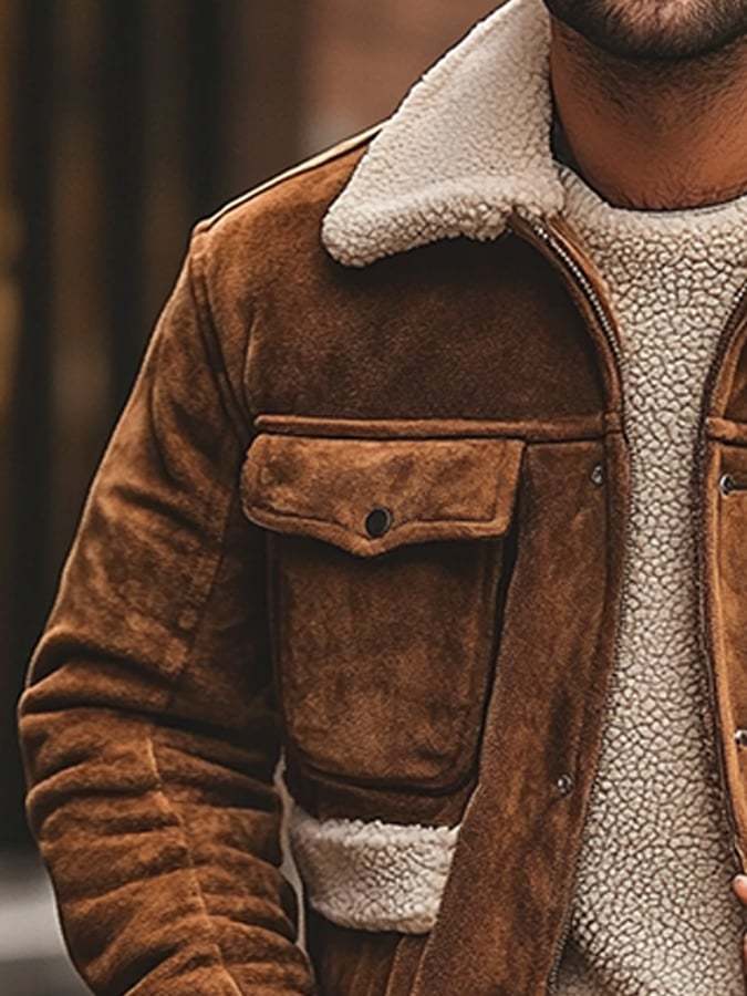 Men's Vintage Suede Patchwork Lamb Fleece Multi-Pocket Reverse Collar Outdoor Jacket
